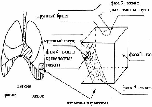 В механике сплошных сред вводятся объемные фазы. Но можно вводить и поверхностные фазы. Такой подход позволяет описывать сложные среды, в которых есть обмен массой между объемом и окружающим пространством. В легких – это обмен через дерево дыхательных путей. В данном случае вход в дыхательные пути рассматривается как поверхностная фаза. Когда к этой поверхности подходит частица газа, то она исчезает. То есть это среда, в которой есть стоки и истоки. Точно также можно поступить и с сосудами. Такая многофазная сплошная среда с двумя поверхностными фазами учитывает многие свойства легких: обмен газом через дыхательные воздухоносные пути и вязкоупругие свойства каркаса. Объясняет рост скорости звука: а) с ростом частоты от единиц до сотен Гц поскольку эффективная жесткость среды увеличивается из-за вязкости и б) с ростом объема легких до ОЕЛ так как каркас становится более жестким.