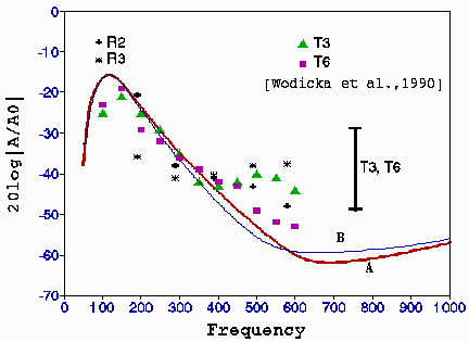 Теоретические кривые А и В построены для точек на поверхности грудной клетки, соответствующих проекции бифуркации трахеи (А) и проекции бифуркации главных бронхов (В). Видно, что от входа в легкие до грудной клетки происходит ослабление сигнала в 100 раз. С ростом частоты прохождение сигнала уменьшается и частоты после 1кГц не регистрируются.