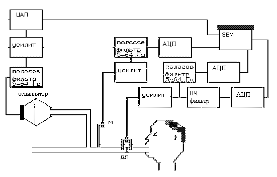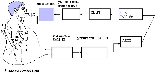В дыхательные пути подаются колебания давления и потока воздуха. На поверхности грудной клетки располагаются микрофоны (или акселерометры), которые регистрируют звук из многих участков легких. Если измерять время прохождения звука, можно определить место возникновения источника звука. Это бывает полезно при диагностике легочных заболеваний. АЧХ легких: входной сигнал - ускорение внегрудного участка трахеи; выходной сигнал - ускорение грудной клетки. Среди известных акустических методов исследования легких измерение амплитудно-частотной характеристики дыхательного тракта обладает рядом преимуществ: высокая интенсивность подаваемого и регистрируемого сигналов и т.д.