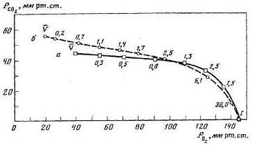 Решаются эти уравнения не так просто из-за того, что содержание газов в крови зависит не только от содержания кислорода в газообменном резервуаре, но и от содержания углекислого газа (в соответствии с эффектом Бора). В результате решения таких уравнений получается зависимость между парциальными давлениями углекислого газа и кислорода, которая называется линией вентиляционно-перфузионных отношений или кривой О2 – СО2 (рис. 7.7.).