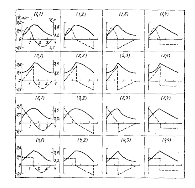 Мы рассматривали газообмен в проточной системе, т.е. системе, в которой газ входит в газообменный резервуар через одну трубку, а выходит из другой. Если мы вернемся к реальным легким, в которых газ входит и выходит из альвеол через один и тот же бронх, то возникнет вопрос – как меняется поток во времени? В такой модели проанализировали влияние формы кривой потока воздуха. На рис. 7.9. представлены различные паттерны дыхания. Ломаная кривая – поток, сплошная – объем.