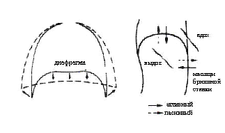 Таким образом, вдох происходит за счет сокращения диафрагмы, брюшных мышц и наружных межреберных мышц. Активный выдох происходит за счет сокращения мышц брюшной стенки и внутренних межреберных мышц. При спокойном дыхании порядка 90% объема обеспечивается диафрагмальным вкладом.
