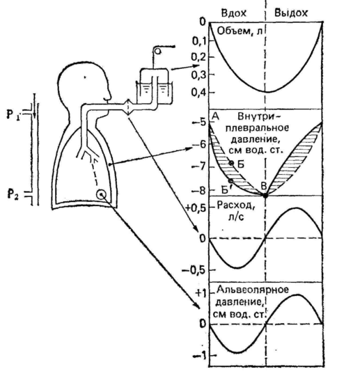 Эксперимент заключается в том, что человек дышит в устройство под названием спирограф. Водный спирометр представляет собой колокол. Этот колокол приподнимается, когда человек выдыхает из себя воздух, т.к. этот воздух поступает по трубке под этот колокол. Через некие шкивы колокол соединен с пишущим устройством, которое регистрирует колебания высоты колокола. Кривая, получаемая с помощью спирографа, изображена справа вверху. В настоящее время для изучения дыхания используются пневмотахометры – приборы, измеряющие скорость потока по количеству оборотов вертушки за определенный момент времени. Сейчас пневмотахометры – это приборы, содержащие некое сопротивление дыханию, через которое протекает поток воздуха. Измеряют разность давлений на этой конструкции (например, сеточке). Эту разность давления переводят путем разных калибровок в величины скорости потока, а, интегрируя скорость потока, получают объем. При этом внутриплевральное давление меняется, как показано на втором рисунке сверху. Пунктиром показана теоретическая кривая, сплошной линией – реальная. Отличие этих двух кривых объясняется наличием вязкостных сил трения. Поэтому на преодоление этих сил уходит около 1 см водного столба. Расход воздуха (производная от объема) изображен на рисунке 3. Альвеолярное давление в ходе дыхательного цикла также изменяется (рисунок 4). При вдохе оно становится отрицательным (порядка 1 см водного столба), а на выдохе – больше атмосферного тоже примерно на 1 см водного столба. На самом деле паттерн дыхания у всех различен. Вдох обычно происходит быстрее, чем выдох, поэтому синусоидальный ход кривой встречается крайне редко.
