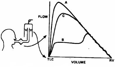 На рисунке представлена кривая «поток-объем» для маневра форсированного выдоха. Выдох производится с разными интенсивностями (А, В, С). А – выдох сразу производится быстро и мощно. Поток начинает быстро увеличиваться с ростом усилия, но с определенный момент происходит пережатие, ограничение потока, и скорость уменьшается. По мере выдоха Pa-PPl уменьшается, поэтому поток продолжает падать. С - если производить выдох сначала спокойно, а в некоторый момент перейти в форсированный режим, то мы придем практически к той же кривой, так как вторая часть кривой форсированного выдоха, как уже говорилось, связана не с усилием, а с эластической тягой легких.