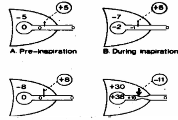 Перед вдохом типичные величины давлений в легких и в дыхательных путях равны 0 (относительно атмосферного давления), в плевральном пространстве -5 см. водного столба. Поэтому трансмуральное давление в трахее равно +5 см. водного столба, т.е. трахея немного растянута.