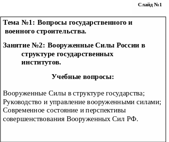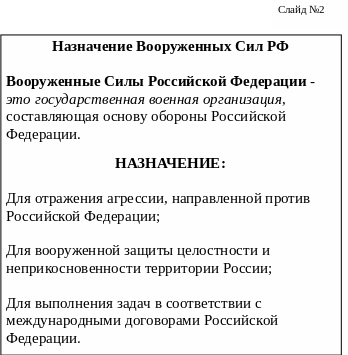 Из сегодняшнего занятия мы можем сделать вывод о том, что Вооруженные Силы России – важная структура государства, призванная защищать его интересы от посягательств извне, а так же от попыток его уничтожения изнутри. Организация военного строительства и руководство войсками нацелены на поддержание мира, на укрепление независимости России.