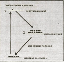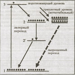 Если в системе с тремя энергетическими уровнями (рис. 2.) производится закачка с уровня 1 на уровень 3, то при спонтанной эмиссии, т.е. распаде верхнего уровня, может быть населен уровень 2. Если это долгоживущий уровень, то со временем величина его населенности увеличивается.