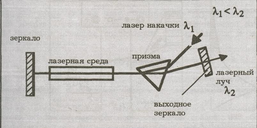 Рисунок 6. Пример коллинеарной накачки лазера другим лазером (лазером накачки). Длина волны генерации всегда больше, чем длина волны накачки, благодаря чему луч накачки и лазерный луч могут быть разделены дисперсионной призмой.