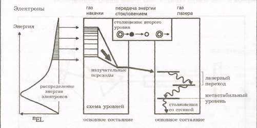 Небольшая часть электронов высокой энергии газового разряда возбуждает высокие уровни газа накачки. Возбужденные состояния распадаются на метастабильный уровень, где накапливается энергия возбуждения. Посредством столкновений энергия накачки переносится на верхний лазерный уровень.