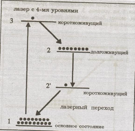Если систему с тремя уровнями расширить еще на один уровень 2' между уровнем 1 и уровнем 2 (рис. 3), то можно избежать проблем трехуровневого лазера в отношении короткой по времени инверсии населенности, при условии, что уровень 2' является очень короткоживущим. Если лазерный переход осуществляется с уровня 2 на уровень 2', то уровень 2' при работе лазера в виду его короткого существования постоянно опустошается на основной уровень. В этой конфигурации даже при незначительной мощности накачки можно постоянно сохранять инверсию населенности между уровнями 2 и 2'. Лазеры с 4-мя уровнями могут поэтому работать в непрерывном режиме.
