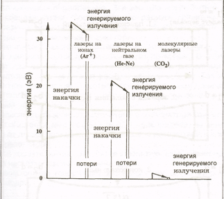 Например, в ионных лазерах нужно сначала обеспечить энергию ионизации, затем энергию возбуждения в ионизированном состоянии. Но для лазерного перехода можно использовать лишь малую долю примененной энергии накачки.