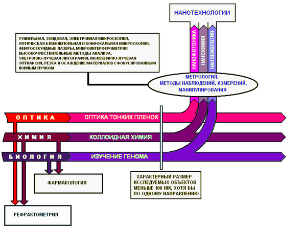 Возникновение такого нового и междисциплинарного направления развития науки и техники как нанотехнологии может быть объяснено следующим образом. По мере развития оптики, химии и биологии появились междисциплинарные области знаний (например, рефрактометрия образовалась на стыке оптики и химии, фармакология – химии и биологии, рисунок 1). Развитие инструментальной и приборной базы послужило развитию направлений, связанных с уменьшением характерного исследуемого размера (например, оптика тонких пленок, коллоидная химия, изучение генома). На определенном этапе по достижении порога в 100 нм хотя бы по одному направлению начинает проявляться квантовомеханическая природа поведения объектов наномира и проявляются размерные эффекты. Наблюдается ряд новых свойств. Направление науки, когда все три области начинают развиваться очень тесно, и называют нанотехнологиями. Объединяются они с помощью метрологии, методов наблюдений, измерений и манипулирования.