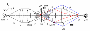 Суть конфокальной микроскопии также поясняется следующей схемой (рисунок 15). От источника (Ист) с помощью оптической системы, состоящей из объектива (О) и микрообъектива (MO1), излучение фокусируется внутрь объекта (Об). Прошедшее через микрообъектив (МО2) и окуляр (Ок) излучение попадает на точечную диафрагму – пинхол (А2). При этом через диафрагму пропускается только излучение 2 (выделено черным) от малой области, лежащей в пределах фокального пятна (ФП) микрообъектива МО2, излучение же 1 и 3 (выделено красным и синим) от других точек, лежащих перед и за исследуемой областью, отсекается диафрагмой (А2).