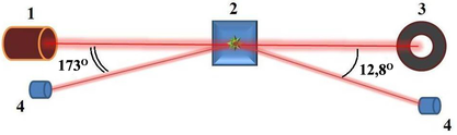 Рисунок 10 – Оптическая схема прибора ДРС: 1 – источник лазерного излучения; 2 – кювета с исследуемым образцом; 3 – ловушка лазерного излучения; 4 – фотоприемники