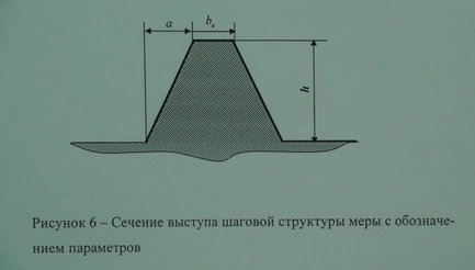 Мера состоит из пяти одинаковых групп шаговых структур по три структуры в каждой группе, имеет маркерные линии и цифры, позволяющие однозначно находить измеряемый элемент рельефа.