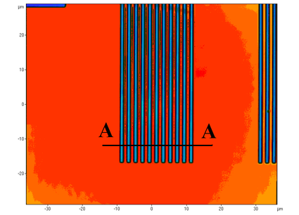 Система конфокального микроскопа позволяет строить профиль сечения на любом интересующем участке полученного изображения. С помощью данной системы попытаемся оценить высоту выступов шаговой структуры рельефа меры путём построения профиля в сечении А-А (рисунок 30).