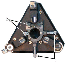 Позиционирование в плоскости XY осуществляется с помощью микрометрических винтов 1 (Рис. 1-9). Напротив микрометрических винтов расположены пружинные упоры 2, которые фиксируют устройство с образцом в позиционере, прижимая его к микрометрическим винтам.