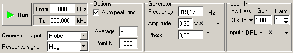 Задайте диапазон, в котором будет измеряться частотная зависимость амплитуды колебаний кантилевера (поля ввода From, To), от 90 до 500 кГц. (Это зависит от кантилевера, нужно уточнять на упаковке).