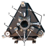 1, 2 – посадочные гнезда для установки измерительных головок; 3 – стойки для установки зеркала; 4 – позиционер; 5 – держатель кабелей измерительной головки; 6 – цилиндр механизма подвода; 7 – гнездо заземления; 8 – винты крепления к базовому блоку