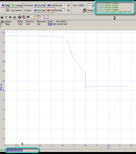 В процессе подвода следите за изменениями сигнала Mag по программному осциллографу, за состоянием индикатора выдвижения сканера и ждите окончания процесса подвода.