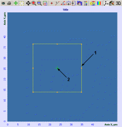 1 – границы выбранной области сканирования; 2 – курсор, показывающий положение зонда