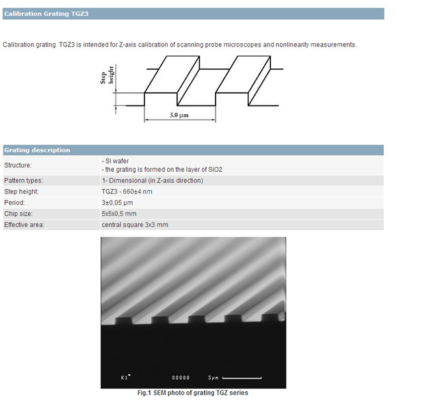 На зондовой лаборатории NtegraSpectra было проведено сканирование тестовой калибровочной решетки TGZ3 фирмы NT-MDT зондом NSG01 этой же фирмы.