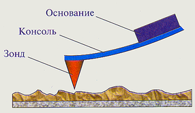 Атомно-силовой микроскоп (АСМ) был изобретён в 1986 году Гердом Биннигом, Кэлвином Куэйтом и Кристофером Гербером. В основе работы АСМ лежит силовое взаимодействие между зондом и поверхностью, для регистрации которого используются специальные зондовые датчики, представляющие собой упругую консоль с острым зондом на конце (рисунок Б.1). Сила, действующая на зонд со стороны поверхности, приводит к изгибу консоли. Регистрируя величину изгиба, можно контролировать силу взаимодействия зонда с поверхностью.