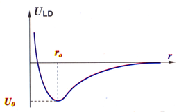 Первое слагаемое в данном выражении описывает дальнодействующее притяжение, обусловленное, в основном, диполь — дипольным взаимодействием атомов. Второе слагаемое учитывает отталкивание атомов на малых расстояниях. Параметр r0 — равновесное расстояние между атомами; U0 — значение энергии в минимуме (рисунки Б.2, Б.3).