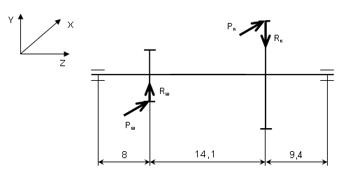 Рисунок 6. Проекции сил, приложенных к валу 5, на плоскость ZY