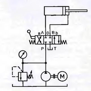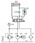 Рабочая жидкость поступает в систему из бака, обозначенного 0.1. Затем насосом 0.4 жидкость подаётся в гидрораспределитель 2.1, который может перенаправлять поток жидкости как в бесштоковую зону гидроцилиндра 2.0 (как на рисунке), так и в штоковую зону. В первом случае шток выдвигается из цилиндара, во втором – втягивается. Предохранительный клапан 0.6 срабатывает при превышении давления в системе, он открывается и жидкость от насоса поступает в бак. Тем самым предотвращаются поломки системы из-за возможного превышения давления. Жидкость, выходящая из системы, направляется в бак. Для задержания частиц износа, образующихся в элементах гидросистемы, на сливной магистрали установлен фильтр 0.7.