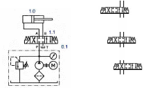 Ниже приведён способ позиционирования, в котором положение штока определяется положением гидрораспределителя 1.1. Движение вправо достигается подключением бесштоковой зоны гидроцилиндра к источнику повышенного давления. Движение налево – подачей давления в бесштоковую зону гидроцилиндра. Фиксация положения осуществляется перекрытием доступа жидкости к обеим зонам. Для этого в распределителе предусмотрена позиция с заглушками (см. рисунок 31 – положение «останов»)