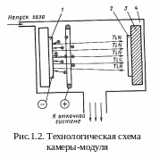 В качестве структурно-компоновочного варианта на этапе технического предложения была принята линейная схема с двусторонним расположением технологических камер по отношению к транспортеру. Структурная схема установки с минимально возможным числом рабочих камер (четыре) приведена на рис. 1.3.