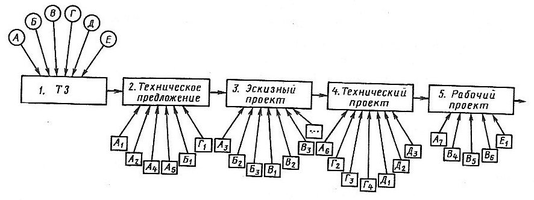 Это можно проиллюстрировать схемой на рис. 1.1, раскрывающей выполнение приведенного выше примера ТЗ. В ТЗ было задано шесть групп условий и требований (А - Е). Их реализация начинается с этапа технического предложения, где разрабатывается технологический процесс и выбирается общая структурно-компоновочная схема.