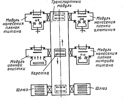 Рис.1.3. Структурно-компоновочная схема многопозиционной установки нанесения тонкоплёночных покрытий в вакууме