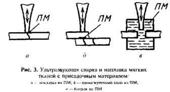 Существуют различные схемы ультразвуковой сварки тканей с присадочным материалом (ПМ) (рис. 3).