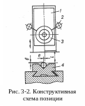 онструктивная схема позиции полуавтомата штабикования показана на рисунке. На ползуне 1 с вертикальным ходом закреплена оправка 3 собранной ЭОС, на которой уже зафиксированы два штабика 2; необходимо закрепить третий. Штабик подается на призму 4, на которой нагревается в стороне от зоны сборки до размягчения стекла. Далее следует быстрый ход призмы (перпендикулярно к плоскости рисунка) и сразу же - вертикальный ход ползуна 1, в конце хода острия иголок внедряются в штабик, который и уносится при возврате ползуна.