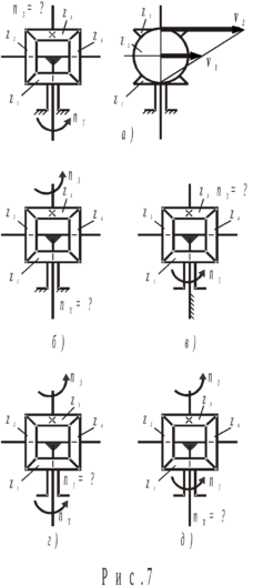 Если ведущими звеньями будут конические колёса z1 и z3 , а ведомым – T-образный вал (рис.7,д), то суммарное движение будет определяться как