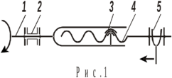 налогичный результат может быть получен на винтовом механизме (рис.2), у которого вал 1, связанный с гайкой 3, имеет возможность не только вращаться, как в описанном варианте, но и перемещаться с помощью вилки 5. Если рассмотреть отдельно воздействие этих движений на вращение ходового винта 4, то получим, что, поворачивая гайку на n оборотов, винт повернётся также на n оборотов, а при перемещении гайки на расстояние l винт совершит