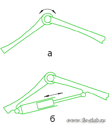 Большинство механических рук промышленных роботов и других манипуляторов более или менее напоминают человеческую руку и содержат последовательно расположенные двигатели, каждый из которых встроен в шарнир или связан с шарниром, имеющим одну степень свободы. На рисунке 1а показан двигатель вращения, расположенный в шарнире; на рисунке 1б линейный двигатель, "охватывающий" шарнир.