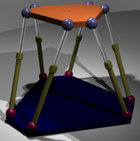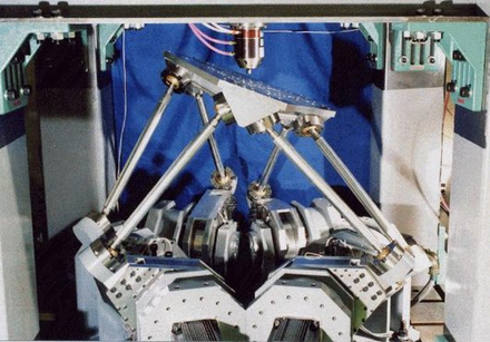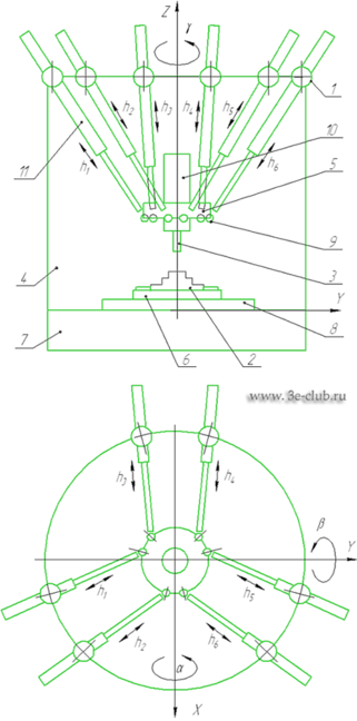 Типичный гексапод выполнен на базе шести механизмов поступательного перемещения, представляющих собой, например, шариковые винтовые передачи ШВП. Для изменения их длины служат регулируемые электроприводы. Контроль за величиной перемещения осуществляется датчиками положения. Одним концом штанга шарнирно соединена с основанием, а другим (также шарнирно) - с подвижной платформой, на которой установлен рабочий орган, например, мотор-шпиндель. Управляя вылетом штанг по программе, можно управлять положением шпинделя по шести координатам: X,Y,Z и тремя углами поворота.
