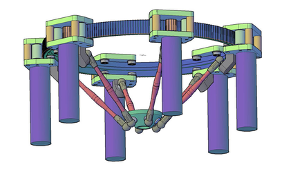 Третьем примером 6-ти осевого параллельного механизма является дельта-механизм. Здесь ведущие вращательные двигатели расположены на основании, а каждая штанга разделена на две части. Первая полуштанга одним концом соединена с двигателем, другим концом - с карданным шарниром, связывающим её со второй полуштангой. Вторая полуштанга через сферический шарнир связана с платформой.