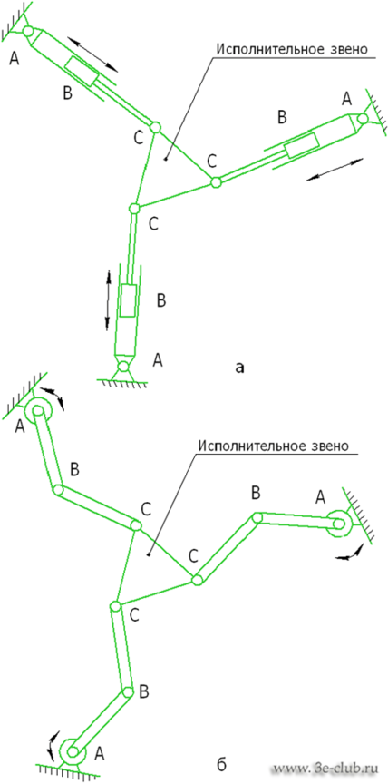 б - с "параллельно действующими" вращательными двигателями в шарнирах А.