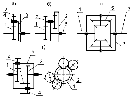 Как видно из приведенных примеров, планетарный механизм можно построить, используя только внутреннее зацепление (рис.3а), или только внешнее зацепление (рис.3в и 4г), или только конические передачи (рис.2 и 3в) или как внутреннее, так и внешнее зацепления (рис.3б, 4а, 4б).