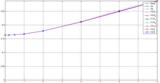 Из этого семейства графиков видно, что уменьшение значения dV увеличивает точность преобразования, что согласуется с теорией. Во всех трех графиках видно, что погрешности преобразования для всех разных форм ВАХ одинаковы и не изменяются в течение времени преобразования. (Кривые не расходятся). Это свидетельствует о том, что реакционная сила в системе практически отсутствует. Особое внимание стоит выделять к третьему случаю, когда dV=0; Погрешность W=0.16 в начале преобразования присутствует из-за постоянного шума амплитудой Um=0.1В.