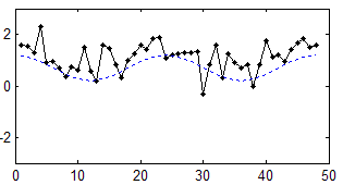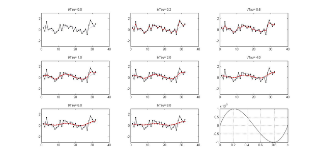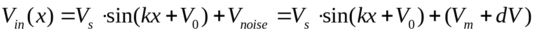 Эталонный сигнал представляет собой синусоиду, к ней добавляется ВЧ гауссов шум, имеющий постоянное добавочное напряжение Vm и переменную составляющую шума с некоторой постоянной максимальной амплитудой dV. Сигнал, подаваемый на вход КНС, описывается уравнением: