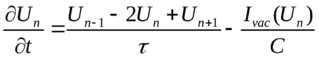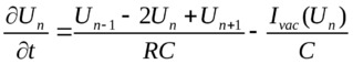 Наноэлектронная клеточная нелинейная сеть это массив элементов, в узлах которого находятся одинаковые элементы. КНС замечательна тем, что делает возможным параллельную фильтрацию зашумленного радиосигнала. Рассмотрим одномерную сеть, она представляет собой цепочку элементов, соединенных последовательно: