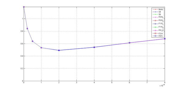 Если отключить реакционную силу с помощью уменьшения максимального тока ВАХ Imax до значения 1мА и увеличения емкости до С=100 пФ, то получаем минимальное значение погрешности Wmin = 0,5 (Рис 5) при следующих значениях остальных параметров R=1 Ом, С=100 пФ, Vs=0,5 В, V0=0,2 В, Vm=0,1 В, dV=0,5 В.
