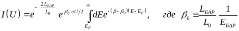 Введенная величина L0 имеет смысл характерной длины затухания волновой функции электрона внутри барьера. При углублении в барьер на это расстояние вероятность найти электрон падает на порядок. Для барьера высотой EБАР =1 эВ эта длина L0 примерно 0,2 нм (Error: Reference source not found), то есть сравнима с размером атома. Подставляя выражение (Ф17) в формулу (Ф15), находим сначала интеграл I(U).