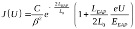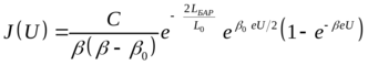 Для барьеров с высотой ЕБАР более 1 эВ и шириной LБАР около 1 нм величина β0 много меньше, чем β. Поэтому в формуле (Ф19) можно положить β –β0 =β. В формуле (Ф19) можно пренебречь экспонентой в скобках по сравнению с 1, если напряжение U больше кТ/е (т.е. ≈30 мВ при комнатной температуре). В результате получается экспоненциальная ВАХ (Ф20).