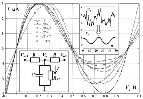 Расчет параметров клеточной нелинейной сети для калибровочного радиосигнала и выбранного зашумленного радиосигнала. Оценка характеристик других параметров, связанных с методом кинетических уравнений. Запуск программы расчета и задание требуемых электрических и геометрических параметров клеточной нелинейной сети. Калибровка программы на примере фильтрации радиосигнала в клеточной нелинейной сети с нелинейным элементом, имеющим эталонную вольтамперную харакетристику. Расчет фильтрации выбранного зашумленного радиосигнала. Построение графиков и анализ полученных результатов. (рис. 3-рис. 4).
